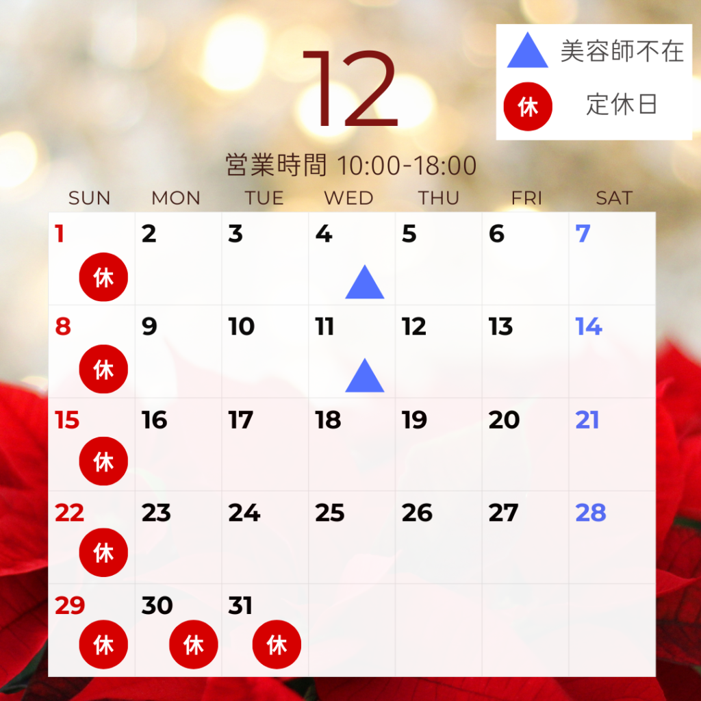 12月営業カレンダー 2024年11月25日 最終更新日時 : 2024年11月25日 ユニコ ウィッグ こんにちは!ユニコウイッグです。 12月店舗の営業日のお知らせです。 よろしくお願いいたします(*^-^*) Follow me!