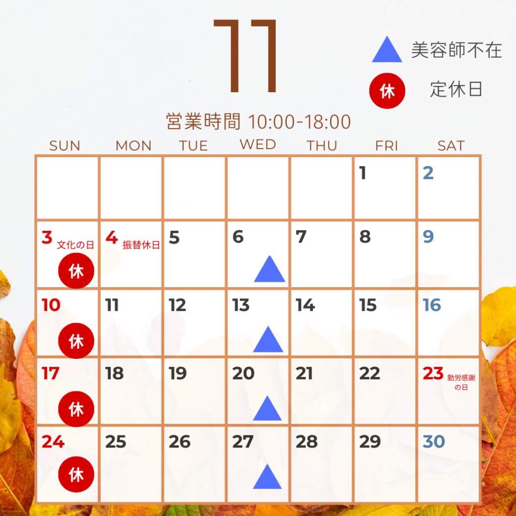 11月営業カレンダー 2024年11月1日 最終更新日時 : 2024年11月1日 ユニコ ウィッグ こんにちは!ユニコウィッグです。 11月店舗の営業日のお知らせです。 よろしくお願いいたします(*^-^*) Follow me!
