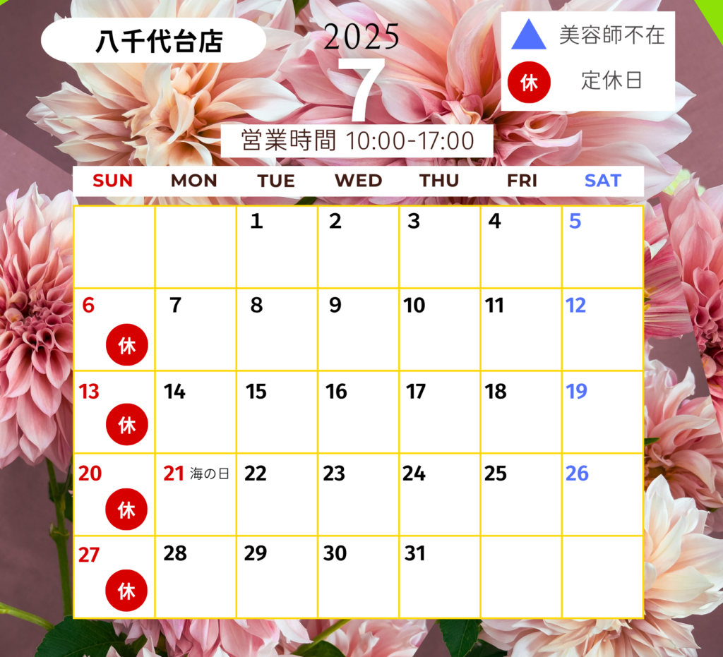 7月営業日カレンダー(都賀本店・八千代台店) 2025年6月26日 最終更新日時 : 2025年6月26日 ユニコ ウィッグ いつもありがとうございます!7月店舗の営業日のお知らせです。 都賀店、八千代台店では他社製ウイッグのシャンプーやカット、セットも承り中! 丁寧なお手入れで、いつものウイッグがもっと輝きます✨✨ 当店では、スムーズにご案内させていただくために、ご予約優先とさせていただいております。 ご希望の日時がございましたら、どうぞお気軽にご予約下さいませ。 (当日のご予約も承っております。) 皆様のご来店心よりお待ちいたしております☺ Follow me!